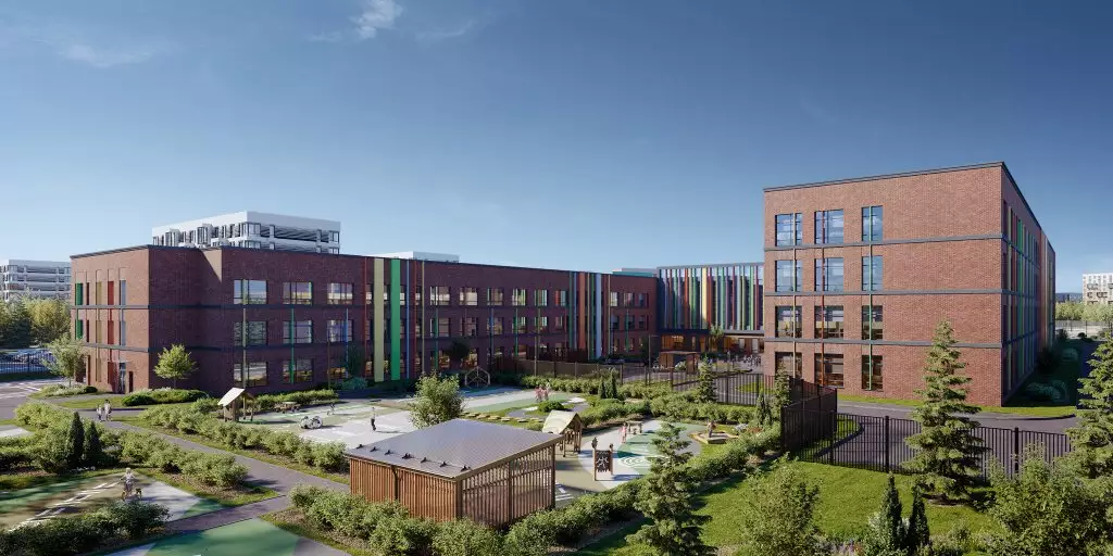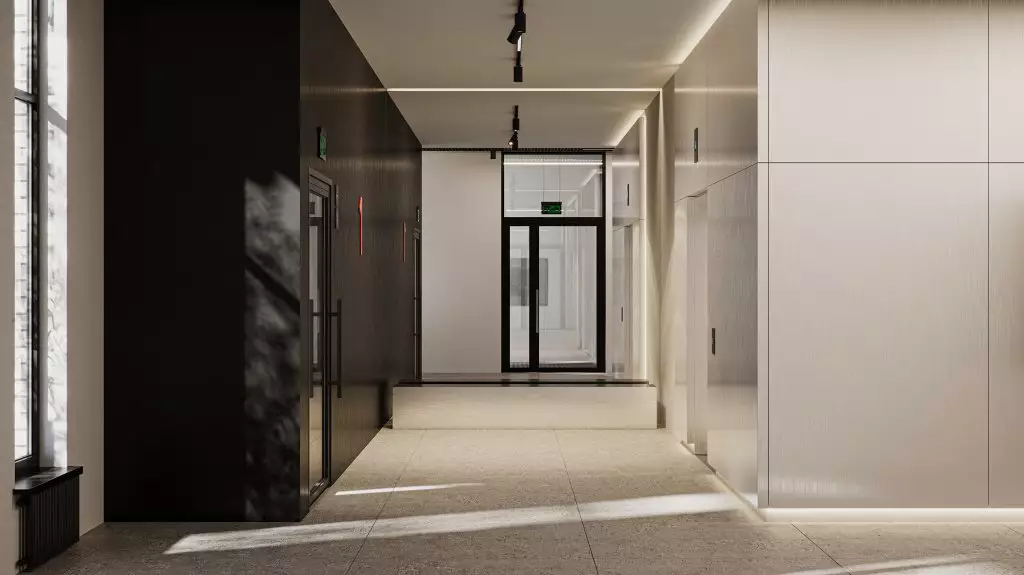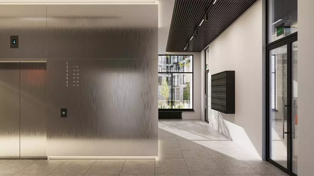В подъездах и на этажах выполнят лаконичную отделку керамогранитом под натуральный камень в монохромных цветах с акцентами в виде оранжевых кубов и ярко выделенной нумерации уровней. Каждая входная группа будет иметь колясочное помещение. Входы в корпуса выполнят на уровне земли для удобства маломобильных жителей.