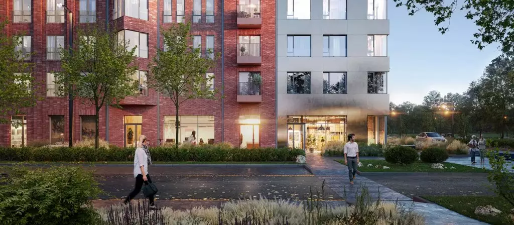 Для минималистичных лобби предложен дизайн интерьеров в светлых тонах с контрастными акцентами, с отделкой натуральными материалами, в том числе мрамором терраццо, применяемым для бесшовного пола. Здесь спроектированы общественные пространства, пешеходные галереи, зона ожидания, помещение для хранения колясок и велосипедов, гостевой санузел с пеленальным столиком. Значительная часть площадей отведена под коммерческие заведения. Подземный уровень займут индивидуальные кладовые и паркинги.