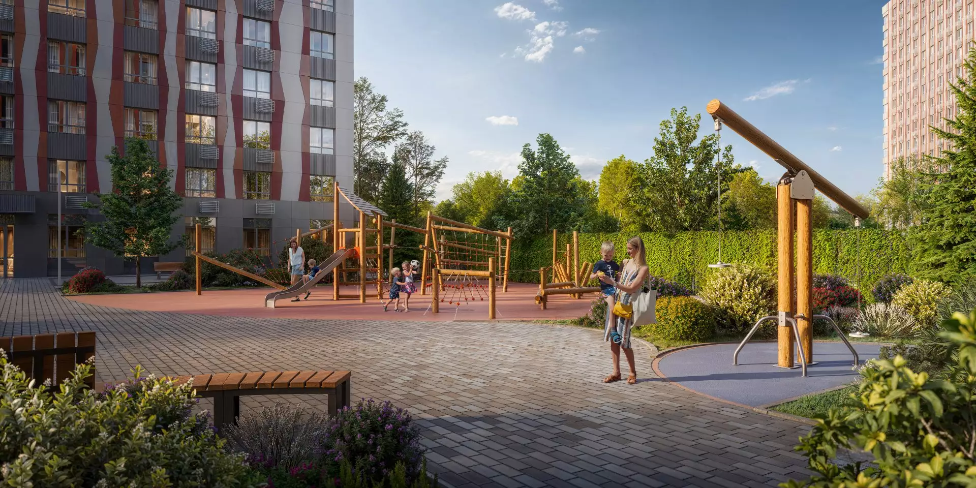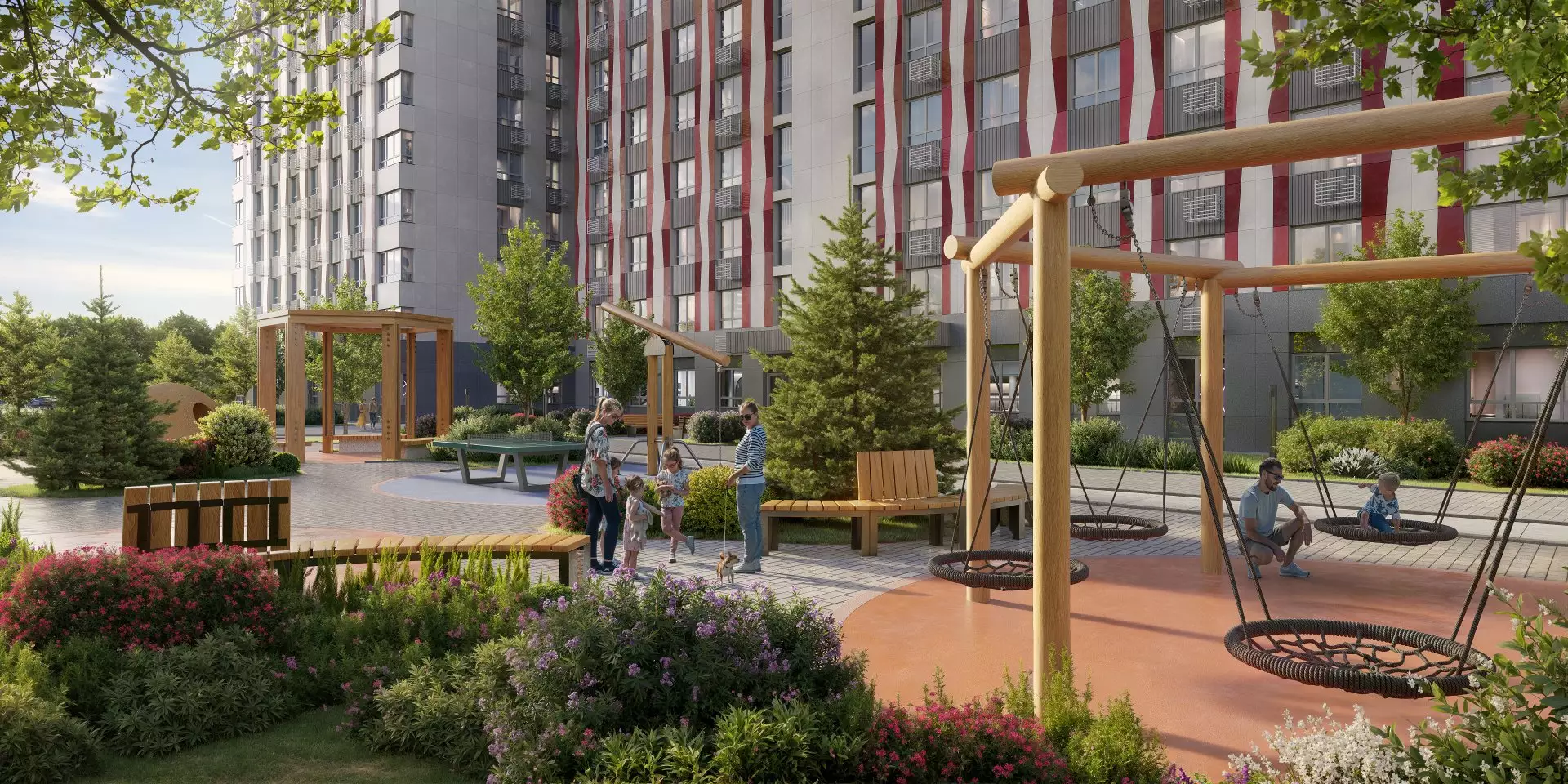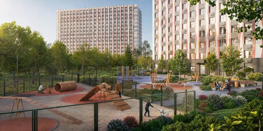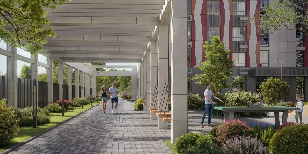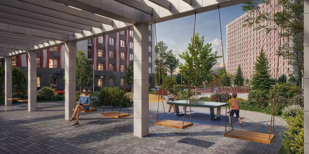 Придомовая территория новостройки будет превращена в двор-парк. Центром притяжения станет пешеходный бульвар-сквер между корпусами. Во дворах оборудуют места для отдыха, детских игр и занятий спортом, площадки для выгула собак. Для парковки автомобилей выделена небольшая открытая наземная стоянка. На первых этажах откроются кафе, магазины, пекарни, пункты выдачи маркетплейсов и сервисы. В пешей доступности от жилого комплекса работают: