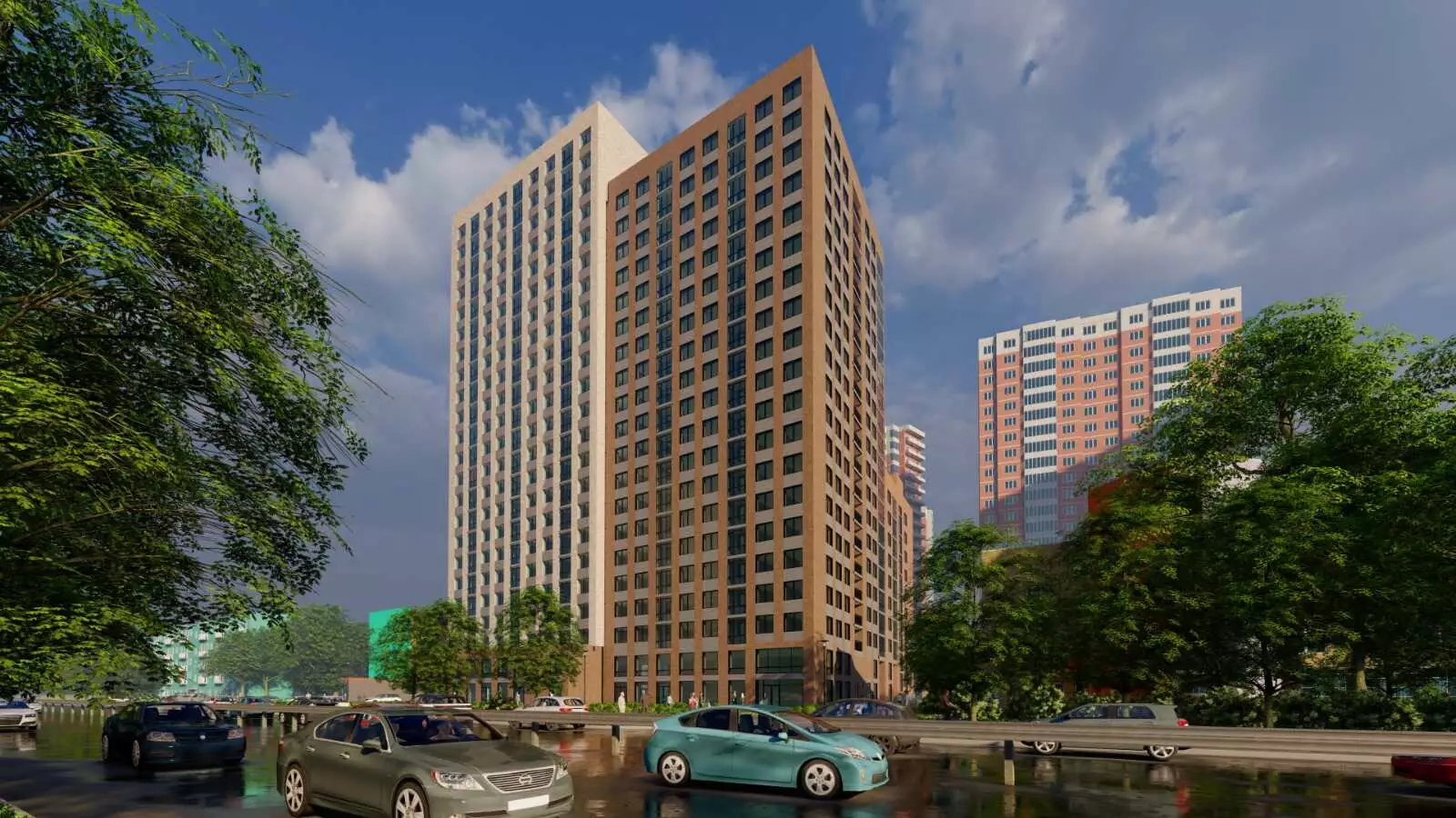 Придомовая территория новостройки спроектирована с учётом комфорта и безопасности жителей. Здесь оборудуют детские площадки с современным игровым оборудованием для разных возрастов, а также спортивные зоны с тренажёрами и площадками для командных игр. Особое внимание в проекте уделено озеленению: будут высажены деревья, кустарники и цветники, формирующие уютную среду. Для удобства жителей предусмотрены открытые парковочные места вне дворовых пределов, а на первых этажах отроются коммерческие помещения, в которых заработают магазины, кафе и другие сервисы. В пешей доступности от квартала работают: