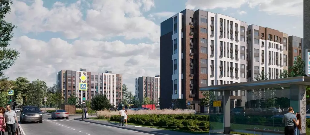 Корпуса новостройки имеют актуальный внешний облик, решенный в минималистичном ключе, но не лишенный оригинальности и красоты. Спокойные светло-серые фасады разнообразят балконы, удачно обыгранные элементами конструкций, и общая рельефность фасадов. Для входных групп предусмотрена лаконичная отделка интерьеров. Здесь выделены консьерж-зоны и колясочные помещения. Первые этажи в основном отведены под коммерческие заведения. Подземных паркингов проектом не предусмотрено.