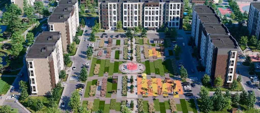 Локация, в которой расположена новостройка, отличается обилием зелени и низкоэтажной застройкой по соседству с ЖК Радость. Рядом находятся садоводческие участки и три водоема, которые планируется благоустроить для комфортного отдыха и занятий спортом. С южной стороны новостройка граничит с лесным массивом, что обеспечивает свежий воздух и приятные виды из окон. Однако также нужно учитывать, что с северной стороны территория жилого комплекса прилегает к железнодорожным путям, а в 700 м от него находится полигон ТБО. Впрочем, благодаря окружающей зелени и ландшафтным решениям его негативное влияние сводится к минимуму.