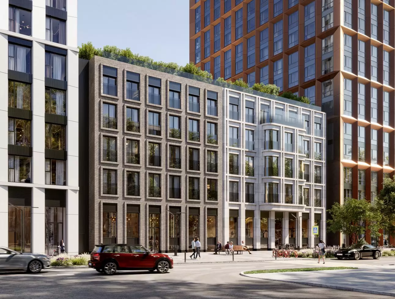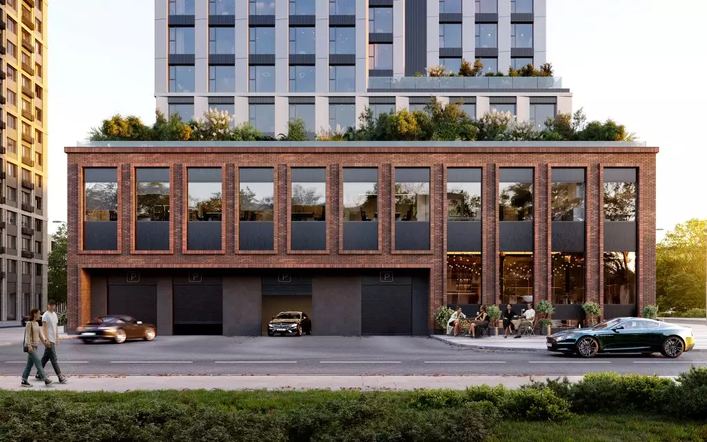 Закрытая охраняемая территория комплекса будет свободна от автомобилей, при этом для гостей предусмотрена парковка за пределами двора. Придомовое пространство зонировано, обеспечивая приватность и удобство для резидентов. На эксплуатируемой кровле стилобата разместят зеленую террасу с зонами отдыха, где установят навесы, шезлонги, перголы и подвесные качели, а также детской площадкой. В центре двора предусмотрен большой игровой комплекс для детей, рядом с которым разместят стеклянный павильон для отдыха взрослых. Кроме того, будет обустроен спортивный хаб с воркаут-зонами и уединенными площадками для занятий йогой. В состав встроенной инфраструктуры квартала войдут:
