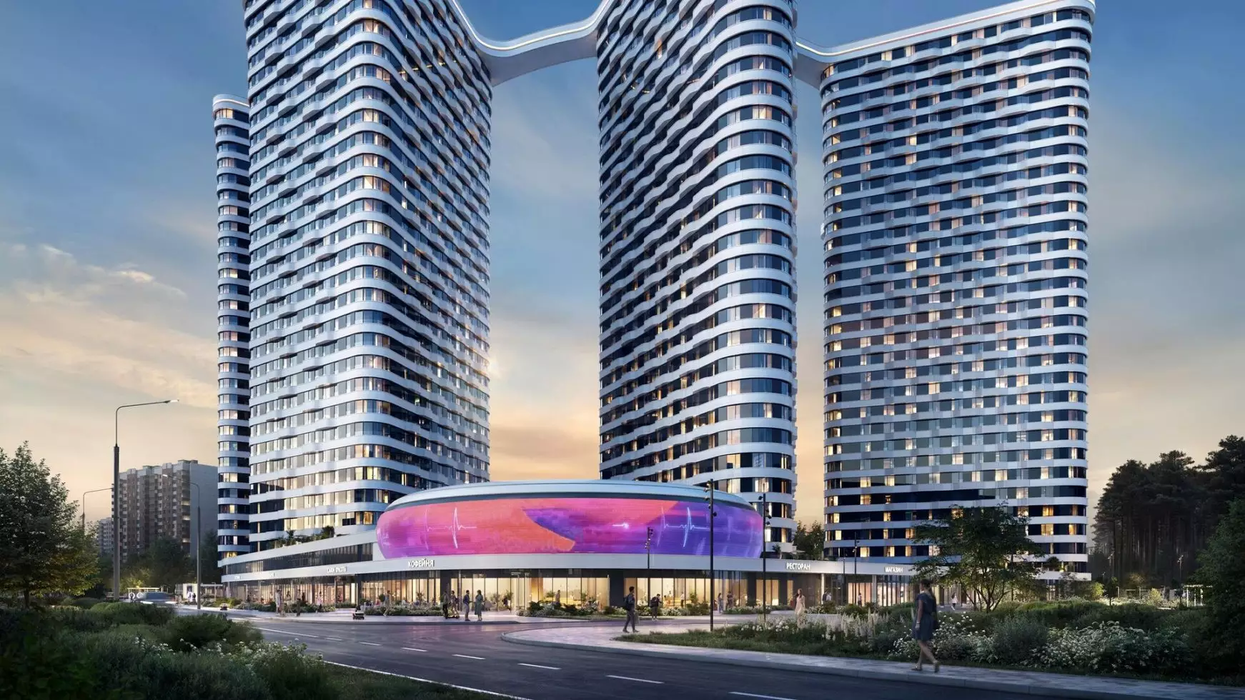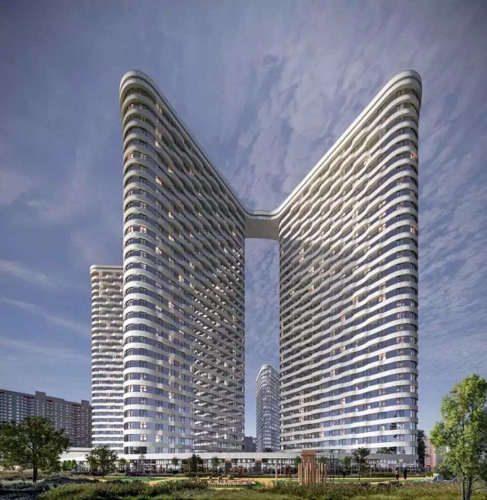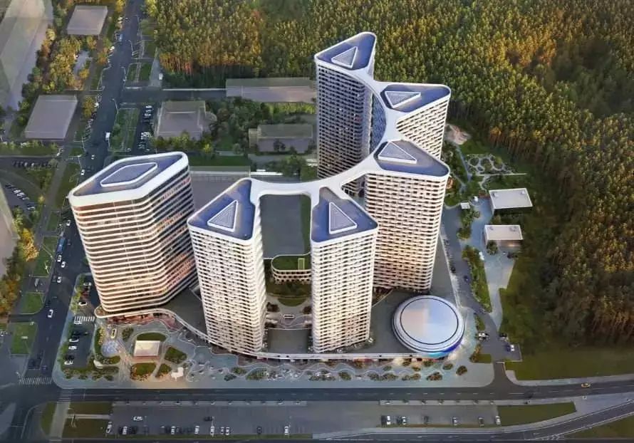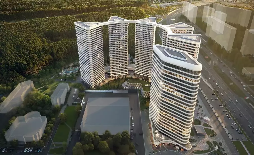 Проект разработан бюро "Горпроект" и отличается футуристичной эстетикой с выразительными вертикальными текстурами фасадов. Композиция зданий основана на кольцевой планировке микрорайона, сформированной в конце XX века. Пять башен выстроены по дуге, создавая динамичный силуэт. Их форма напоминает триангулярные и ромбовидные призмы, объединенные парящим скай-мостом на уровне 30-го этажа. Он станет главным архитектурным элементом, визитной карточкой комплекса. Виден и техногенный подтекст — с высоты комплекс напоминает шестеренку. В дополнение к жилым зданиям предусмотрен 25-этажный деловой центр, а центральным объектом ансамбля станет киберспортивная арена с панорамным телеэкраном. На первых этажах башен обустроят просторные лобби с панорамными окнами, авторским интерьером и функциональными зонами. В местах ожидания установят мягкую мебель и мини-библиотеку, а у входа гостей встретит консьерж за стойкой ресепшен. Входные группы включат лаунж-пространства, коворкинги, колясочные, велопарковки и лапомойки. Здания соединит общий стилобат, в котором разместятся коммерческие помещения. Подземный уровень отведен под паркинг на 261 машино-место и 172 кладовых.