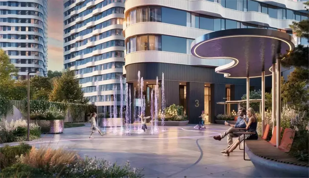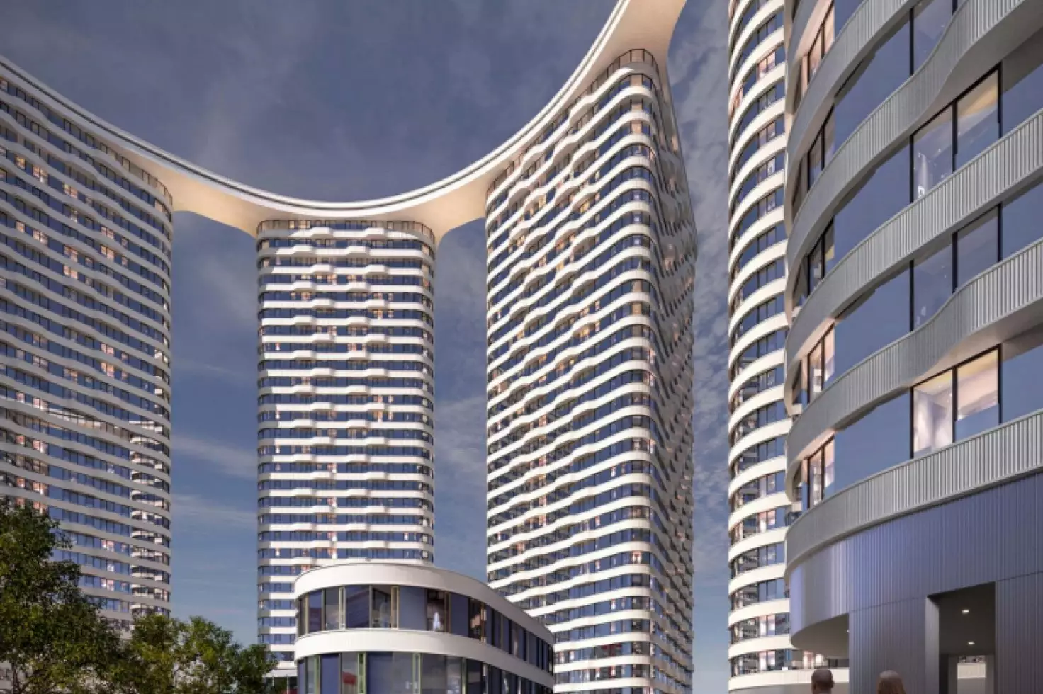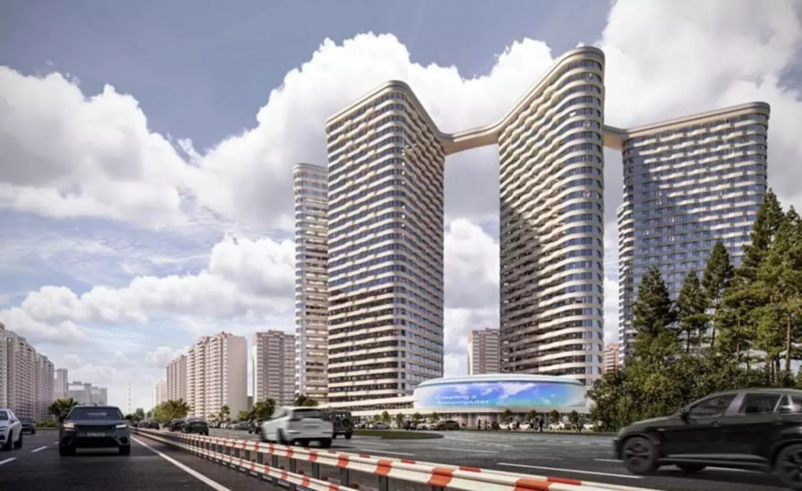 Проект разработан бюро "Горпроект" и отличается футуристичной эстетикой с выразительными вертикальными текстурами фасадов. Композиция зданий основана на кольцевой планировке микрорайона, сформированной в конце XX века. Пять башен выстроены по дуге, создавая динамичный силуэт. Их форма напоминает триангулярные и ромбовидные призмы, объединенные парящим скай-мостом на уровне 30-го этажа. Он станет главным архитектурным элементом, визитной карточкой комплекса. Виден и техногенный подтекст — с высоты комплекс напоминает шестеренку. В дополнение к жилым зданиям предусмотрен 25-этажный деловой центр, а центральным объектом ансамбля станет киберспортивная арена с панорамным телеэкраном. На первых этажах башен обустроят просторные лобби с панорамными окнами, авторским интерьером и функциональными зонами. В местах ожидания установят мягкую мебель и мини-библиотеку, а у входа гостей встретит консьерж за стойкой ресепшен. Входные группы включат лаунж-пространства, коворкинги, колясочные, велопарковки и лапомойки. Здания соединит общий стилобат, в котором разместятся коммерческие помещения. Подземный уровень отведен под паркинг на 261 машино-место и 172 кладовых.