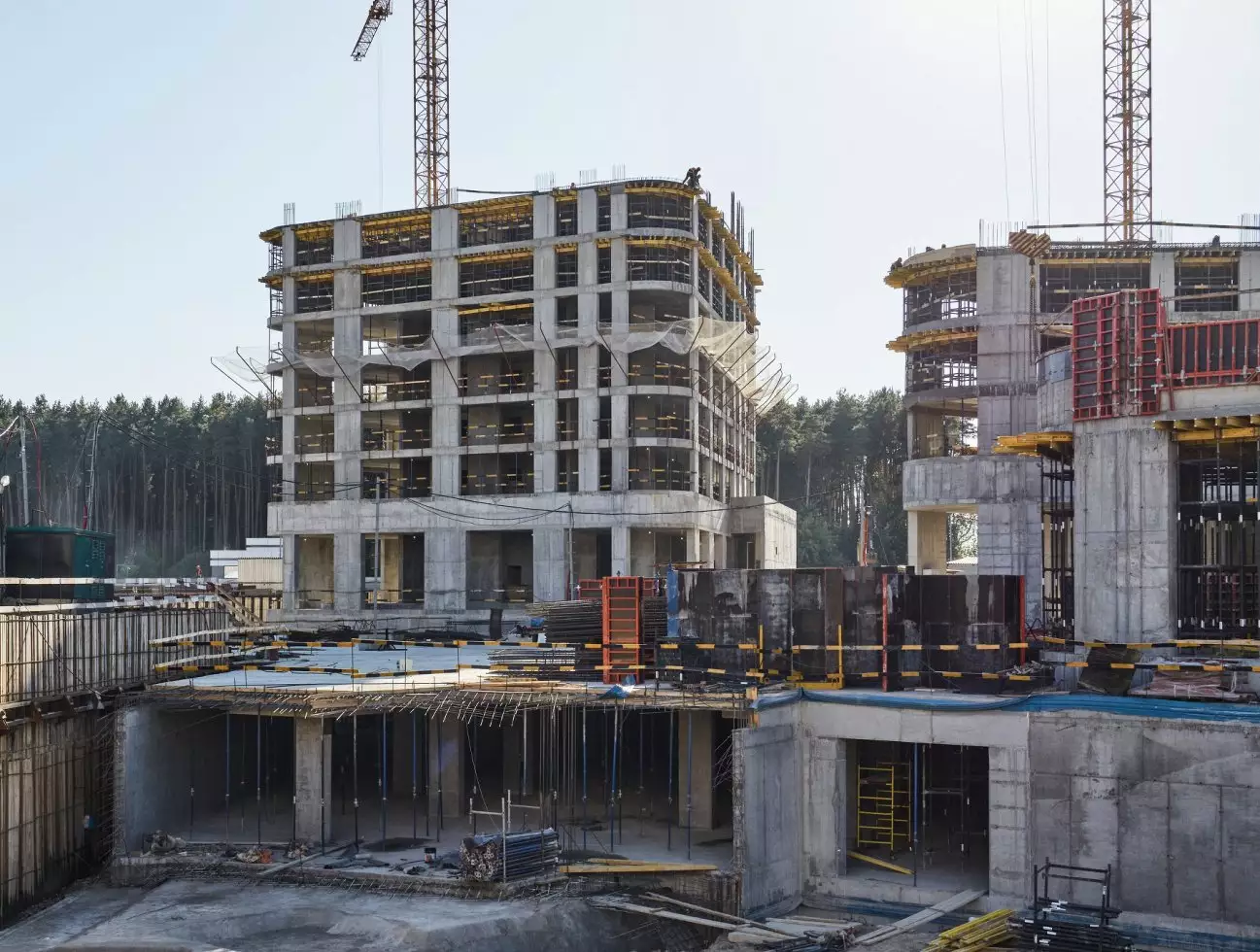 Здания возводят по монолитно-кирпичной технологии с фасадами из металла, дерева и белого архитектурного бетона. Окна выполнят в панорамном формате. В корпусах установят современное инженерное оборудование и передовые системы безопасности, включая круглосуточное видеонаблюдение. Для удобства жителей предусмотрены бесшумные скоростные лифты, обеспечивающие доступ на жилые этажи и в паркинг: по четыре кабины на каждый корпус.