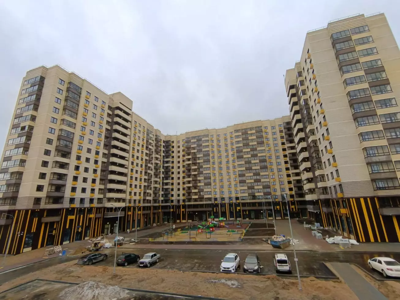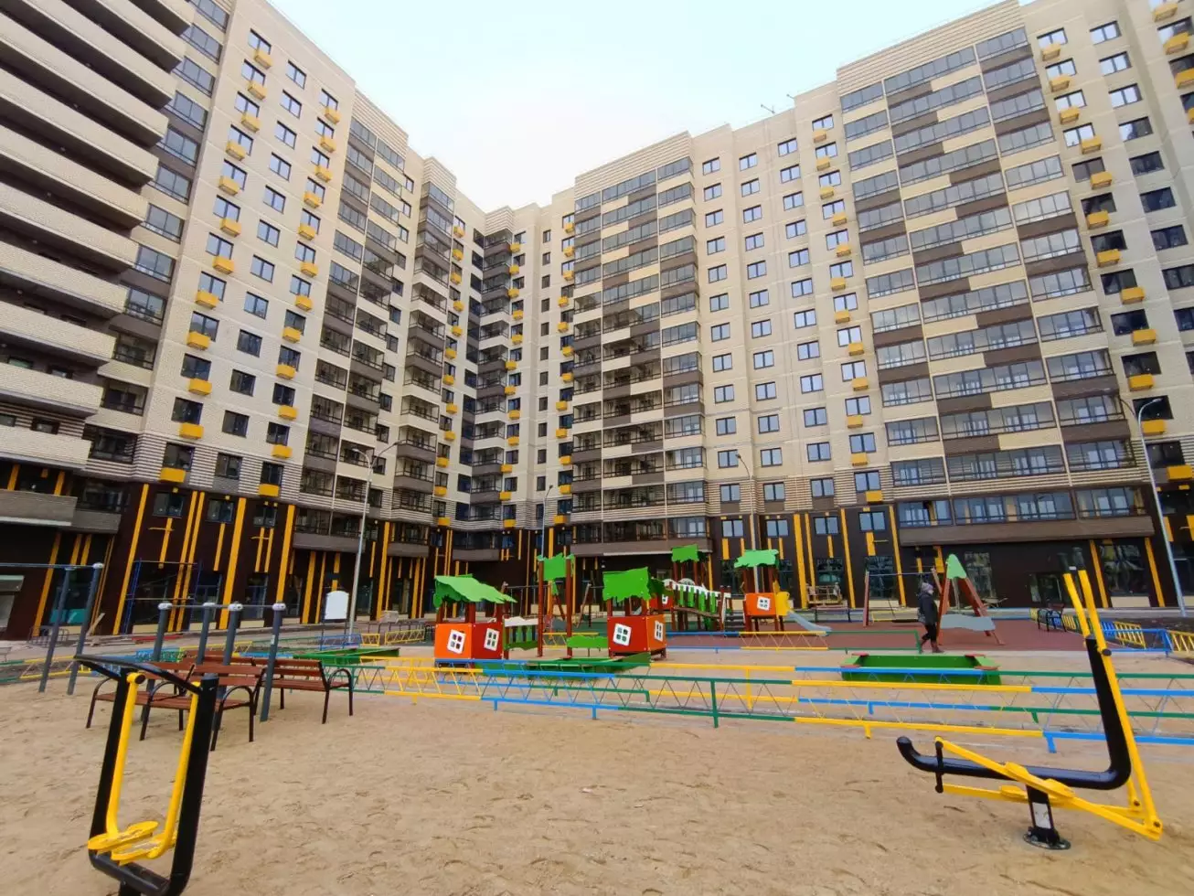 Дворовая территория первого корпуса спроектирована с учетом потребностей всех жителей. Здесь есть прогулочный бульвар с ландшафтным озеленением, детская площадка и несколько спортивных зон для активного отдыха. Велосипедные дорожки делают передвижение по двору еще удобнее. Пространство защищено от улицы живой изгородью, а у подъездов высажены аккуратные газоны и цветочные клумбы. Второй корпус также получит благоустроенную территорию с футбольным и баскетбольным полями. В состав встроенной инфраструктуры квартала войдут: