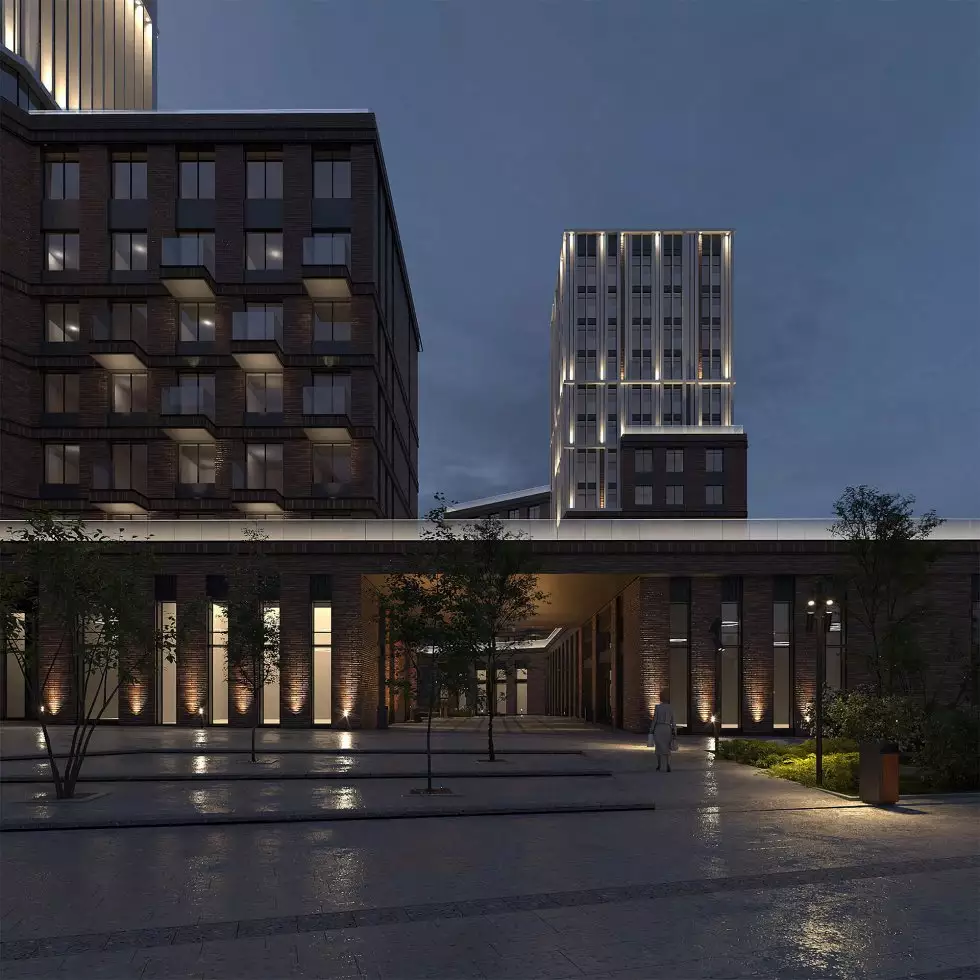 Проект Sokolinn Park демонстрирует современную архитектуру, где эстетика сочетается с практичностью. Фасады украшены бетонной плиткой под кирпич и композитными панелями. Это сочетание создает выразительный облик зданий. Разновысотные башни, соединенные стилобатом, органично дополняют городскую застройку. Панорамные окна наполняют квартиры светом и открывают виды на зелёные окрестности. Остекленные летние помещения добавляют фасадам воздушности. Тёплая архитектурная подсветка выделяет детали здания, делая облик новостройки запоминающимся. Мягкий свет подчёркивает выразительность форм и создаёт уютную атмосферу, перекликаясь с природным окружением. Дизайн лобби разработан бюро А4. Эти пространства в обоих корпусах выдержаны в лаконичном стиле в унисон экстерьеру: с чёткими линиями и формами и с отделкой натуральными материалами. Тёплое освещение и удобная мебель располагают посетителей к отдыху. На первом этаже запланированы 1757 м² коммерческих помещений. Подземный уровень включает паркинг на 94 машино-места с зарядками для электрокаров. Жителям также доступны 54 индивидуальные кладовые разных размеров общей площадью 248 м².
