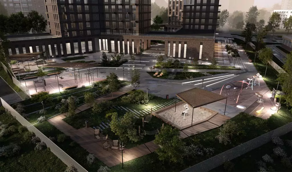 Проектом предусмотрен закрытый двор, свободный от машин. Благоустройство территории учитывает разные сценарии использования в течение дня. Здесь будут созданы зоны для общения, отдыха и активного времяпрепровождения. Для работы на свежем воздухе предусмотрены коворкинг-пространства. Спортивная зона позволит взрослым заниматься спортом, игровая площадка обеспечит безопасные развлечения детям. На первых этажах корпусов откроются магазины, кафе, пекарни, салоны красоты, барбершопы и другие сервисы. В пешей доступности от дома работают: