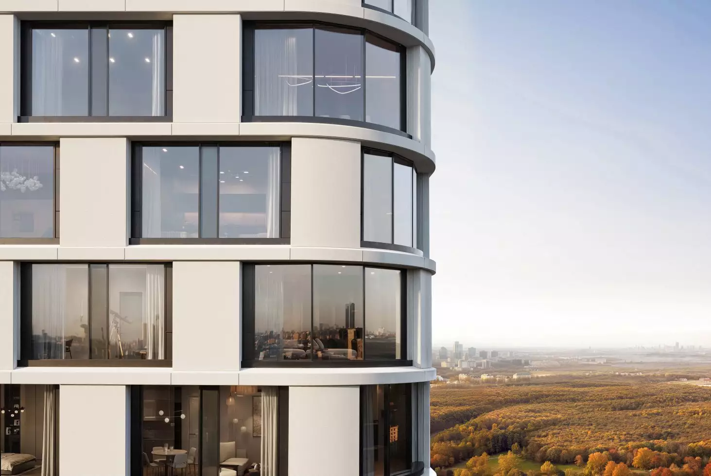 В новостройке представлены планировки площадью от 28,1 до 141,48 м² с числом спален от одной до четырех, высокими потолками (от 3 м), панорамными окнами, просторными кухнями, отдельными кабинетами и гардеробными. Внутри помещений предусмотрены напольные радиаторы и централизованное кондиционирование. На верхних уровнях предложат 16 пентхаусов площадью от 76,2 до 141,52 м² с возможностью создания каминного зала, детских игровых комнат или приватного сада на террасе с живописным видом на реку. Из окон большинства квартир откроются виды на крупнейший парк Москвы. Все жилье застройщик намерен передавать без отделки.