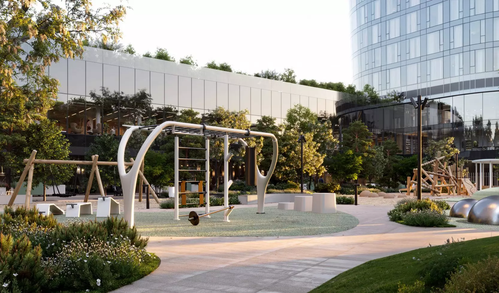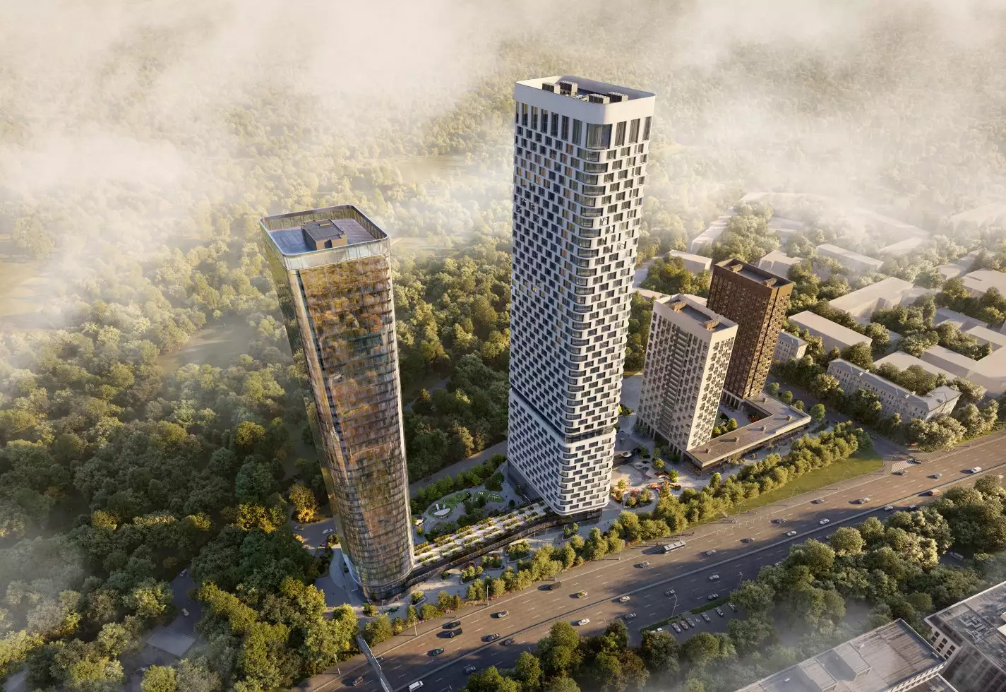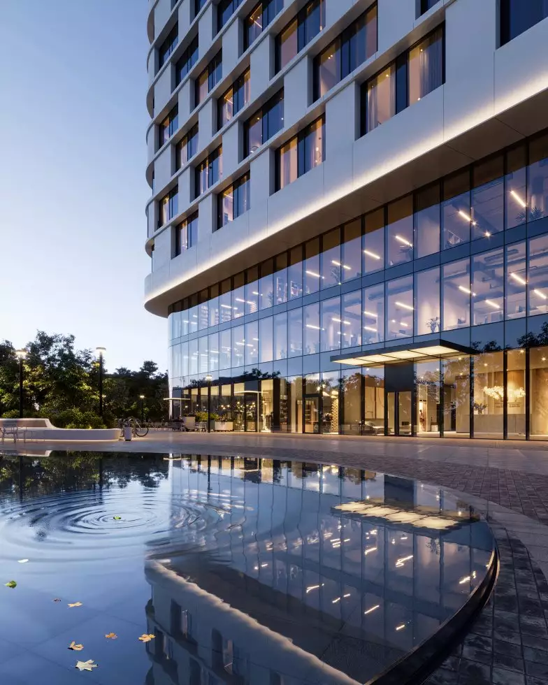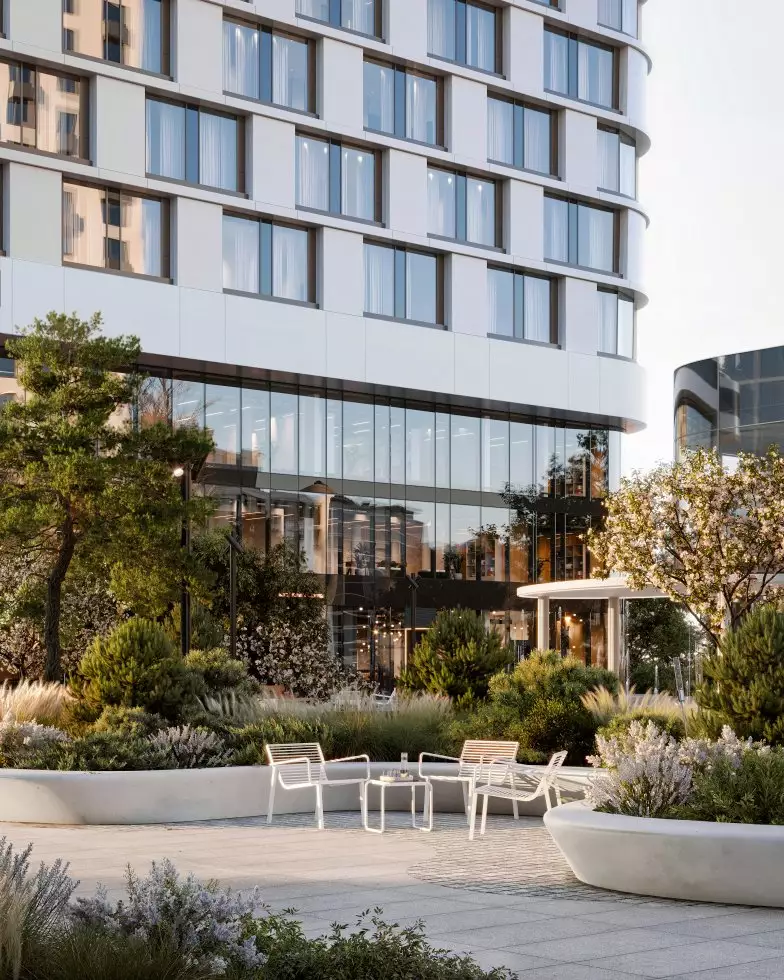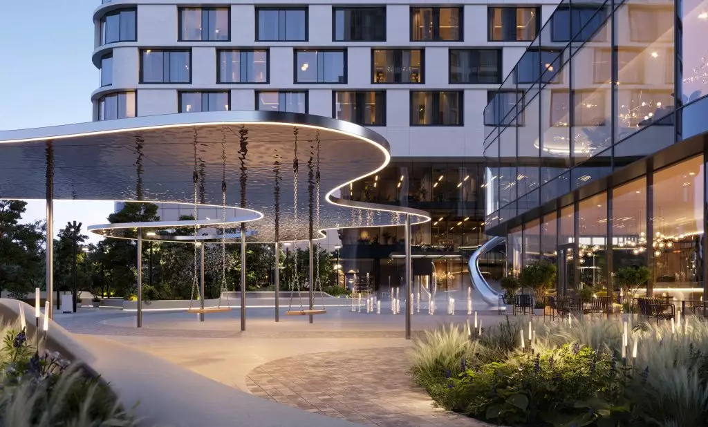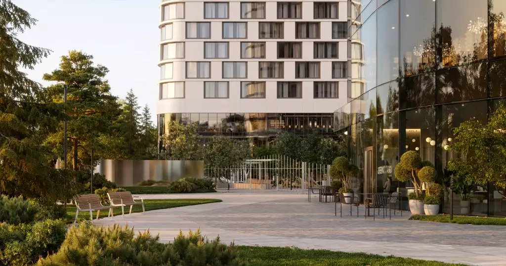 Бюро Scape взяло на себя задачу преобразовать территорию новостройки, создав современное и уютное пространство, где жители могли бы ощутить связь с природой. Разработанный проект сочетает в себе принципы биофильного дизайна и скандинавский стиль, включая насыщенное озеленение, зонирование с плавными линиями, водные элементы и зеркальные поверхности. Использование бионических форм в планировке ландшафта добавляет элемент природного разнообразия, характерного для естественных лугов, полян и холмов. Приватные зеленые зоны обеспечат возможность уединения, позволяя скрыться от городской суеты и насладиться открытым небом, бегущей водой и своими мыслями. Линейный лесопарк с ярусной посадкой деревьев и кустарников защитит территорию от городского шума и предложит прогулочные маршруты, площадки для отдыха и зоны для выгула собак. Вблизи главного входа в башни выделена общественно-деловая площадь, где сойдутся основные пешеходные маршруты комплекса. Во внутреннем дворе размещена центральная площадь для общения и проведения мероприятий с фонтаном, арт-объектами, инсталляциями, зонами для летних кафе. Закрытые и охраняемые дворы без машин разделены на функциональные зоны, где предусмотрены природные тропы в тени деревьев, места для тихого отдыха, детские игровые и спортивные площадки, беседки для барбекю и уголки с шахматными столиками и перголами. В состав встроенной инфраструктуры квартала войдут: