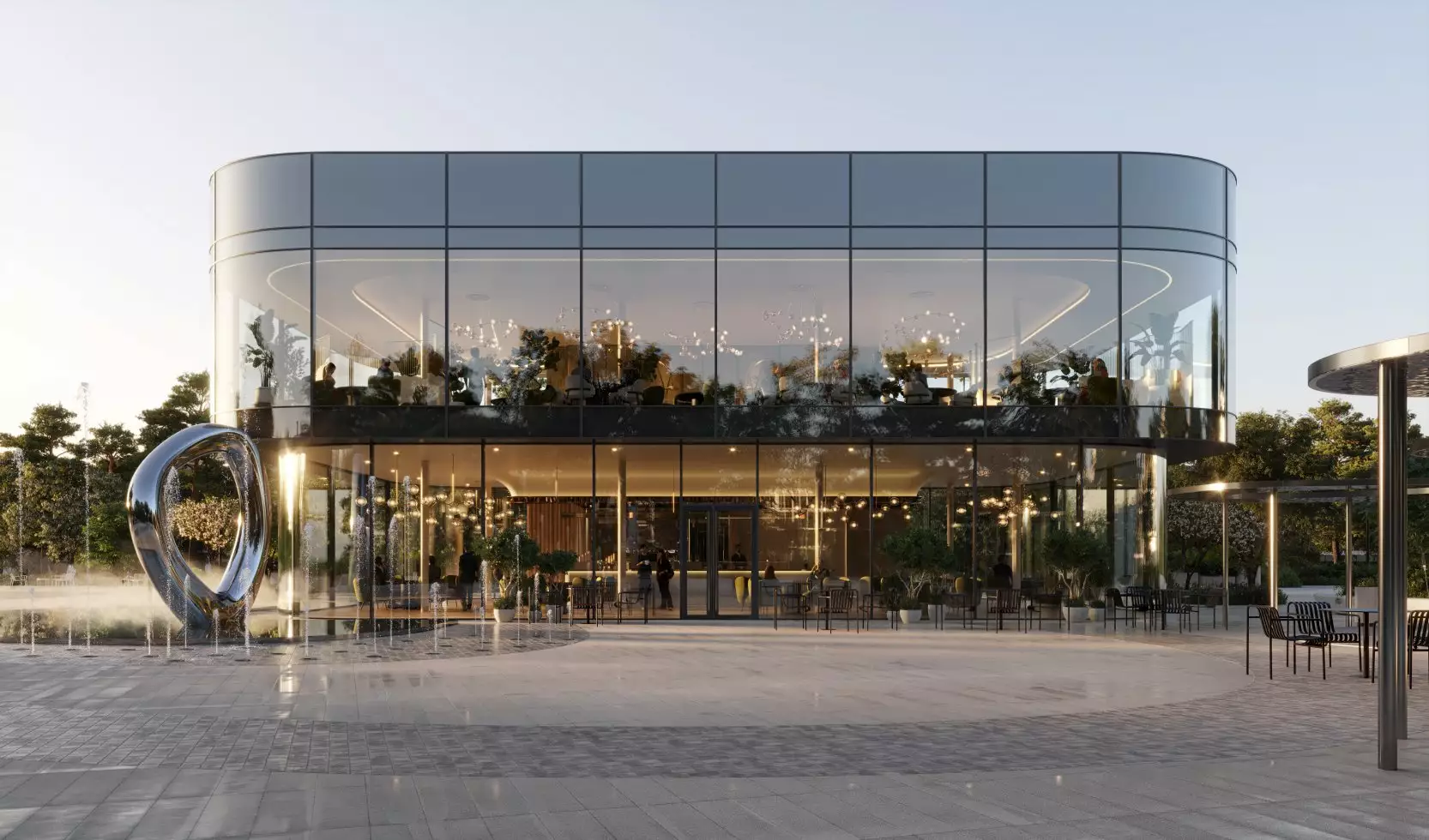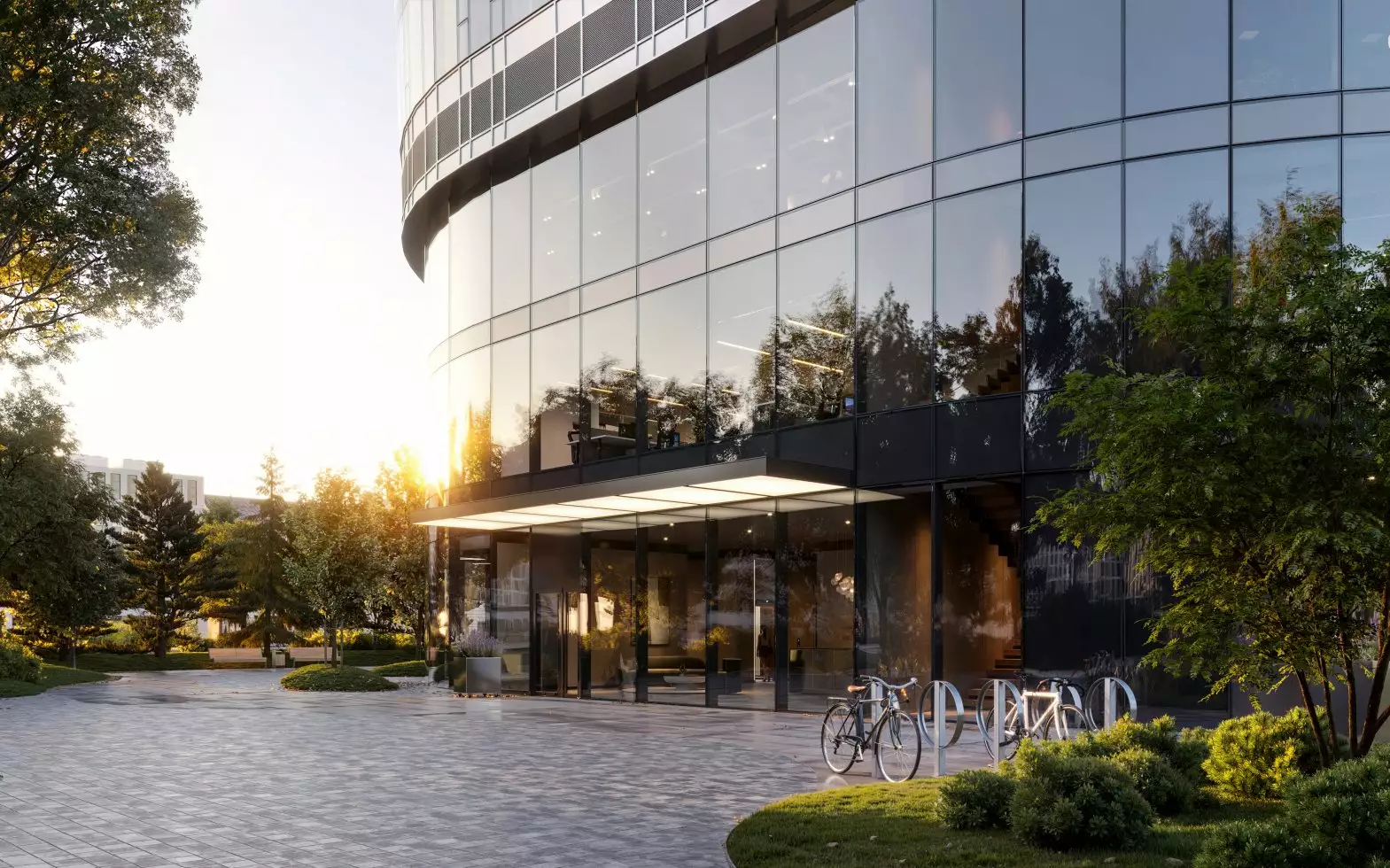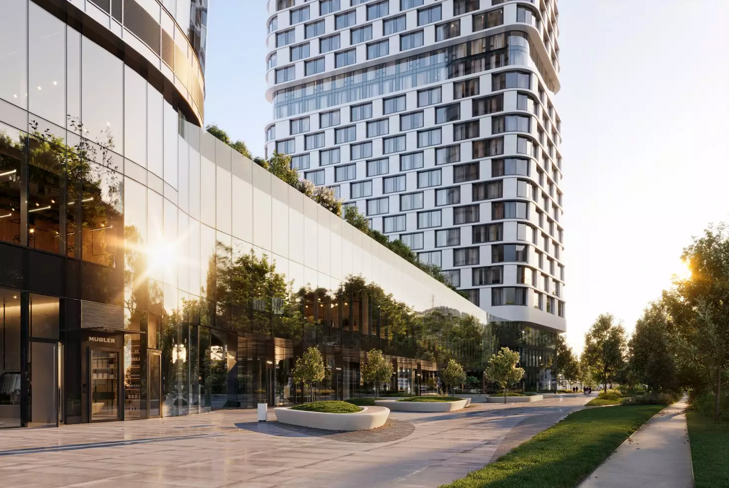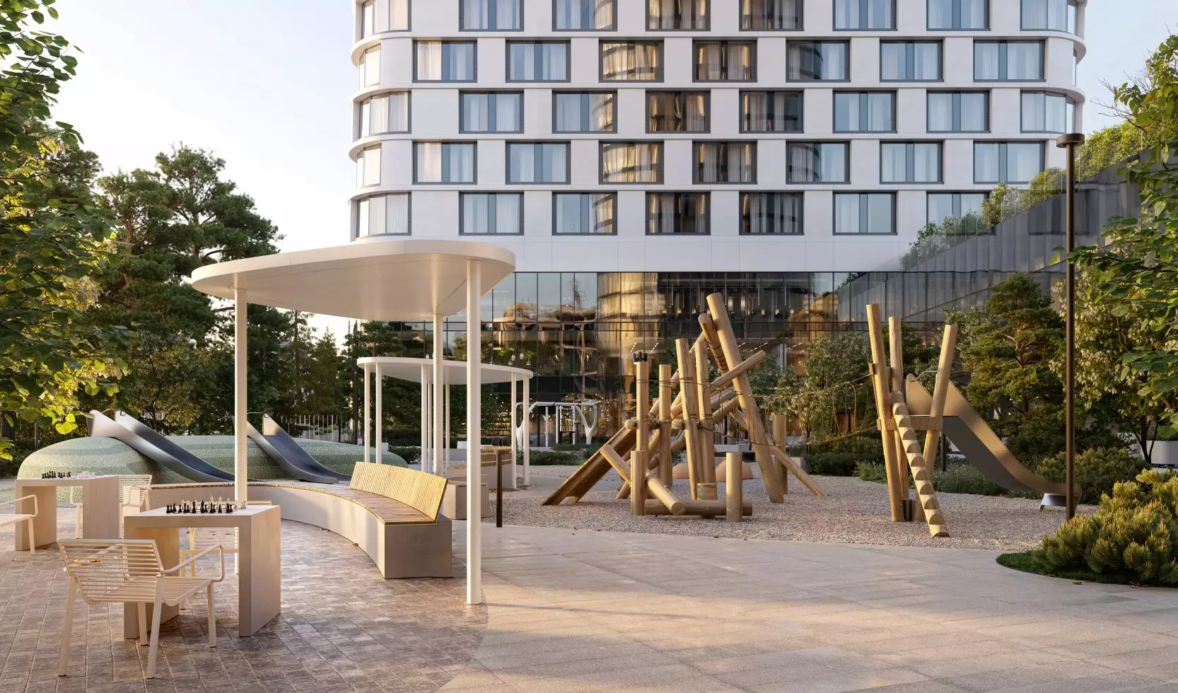 Бюро Scape взяло на себя задачу преобразовать территорию новостройки, создав современное и уютное пространство, где жители могли бы ощутить связь с природой. Разработанный проект сочетает в себе принципы биофильного дизайна и скандинавский стиль, включая насыщенное озеленение, зонирование с плавными линиями, водные элементы и зеркальные поверхности. Использование бионических форм в планировке ландшафта добавляет элемент природного разнообразия, характерного для естественных лугов, полян и холмов. Приватные зеленые зоны обеспечат возможность уединения, позволяя скрыться от городской суеты и насладиться открытым небом, бегущей водой и своими мыслями. Линейный лесопарк с ярусной посадкой деревьев и кустарников защитит территорию от городского шума и предложит прогулочные маршруты, площадки для отдыха и зоны для выгула собак. Вблизи главного входа в башни выделена общественно-деловая площадь, где сойдутся основные пешеходные маршруты комплекса. Во внутреннем дворе размещена центральная площадь для общения и проведения мероприятий с фонтаном, арт-объектами, инсталляциями, зонами для летних кафе. Закрытые и охраняемые дворы без машин разделены на функциональные зоны, где предусмотрены природные тропы в тени деревьев, места для тихого отдыха, детские игровые и спортивные площадки, беседки для барбекю и уголки с шахматными столиками и перголами. В состав встроенной инфраструктуры квартала войдут: