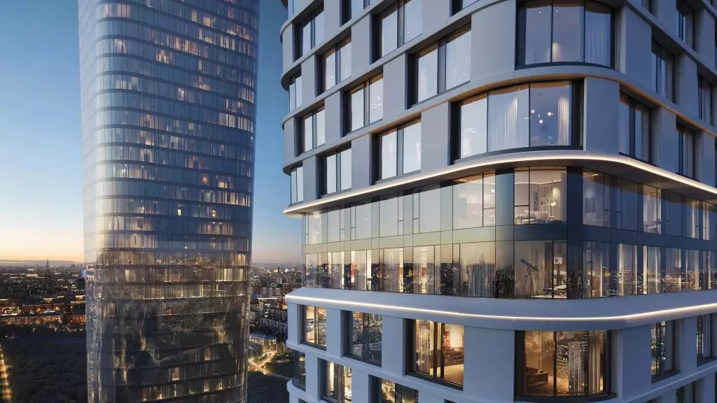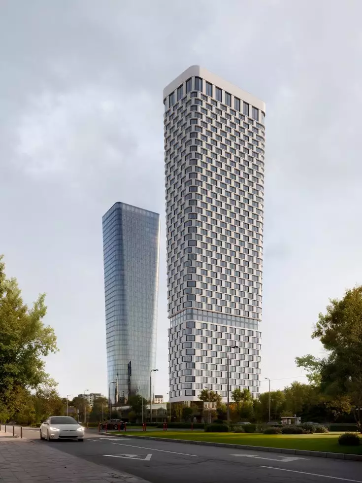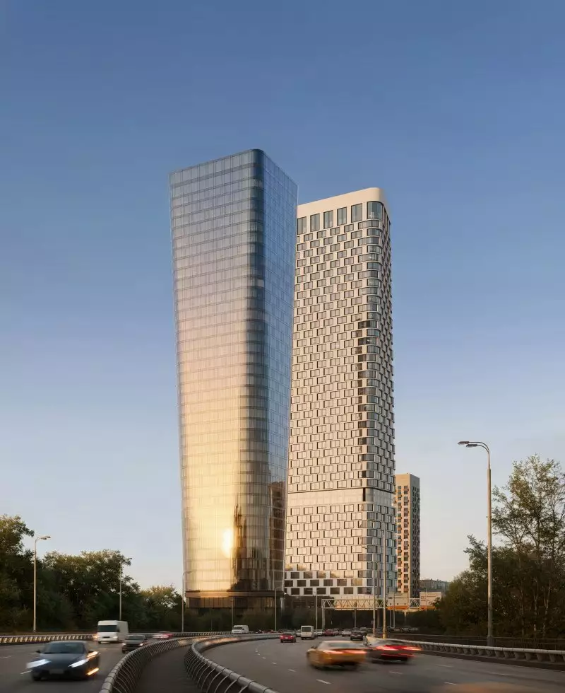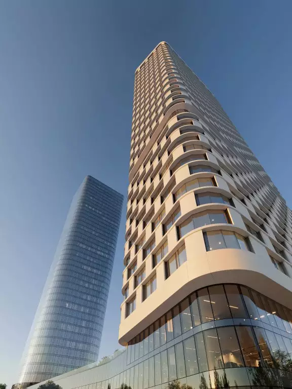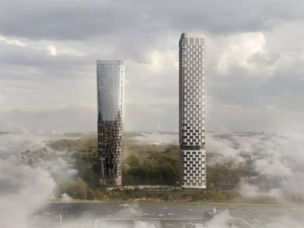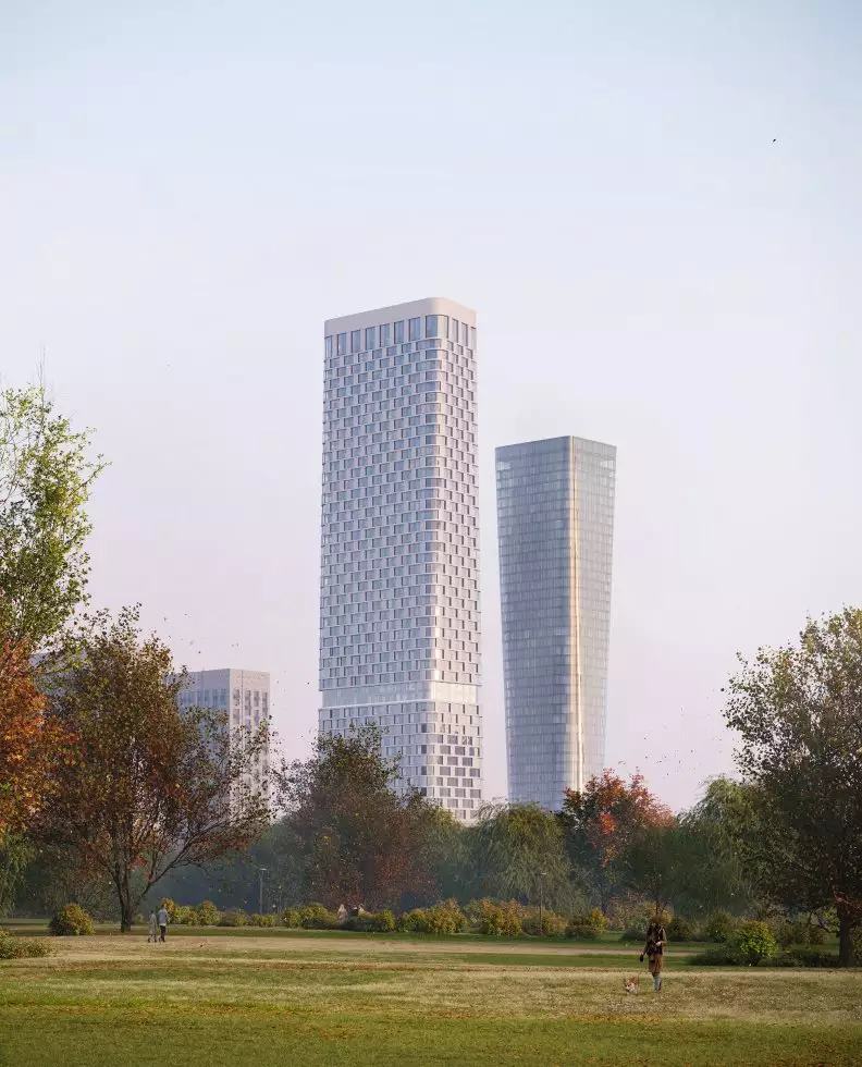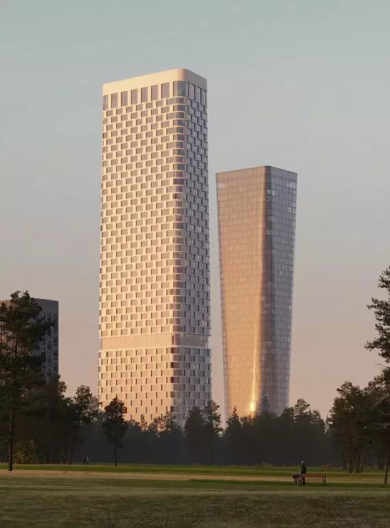 Проект новостройки разработан известным бюро Kleinewelt Architekten, он представляет минималистичную и в то же время выразительную архитектуру, сочетающую в себе функциональность и эстетичность. Эффект визуальной легкости небоскребов достигается благодаря плавным спиралевидным формам оснований, которые переходят в строгие геометрические линии, а также за счет "прозрачности" зданий. Панорамное (витражное) остекление подчеркивает футуристичность облика жилого комплекса, усиливая впечатление в вечернее и ночное время с помощью изысканной архитектурной подсветки. В отделке фасадов использованы различные текстуры, которые незаметно переходят друг в друга, придавая зданиям ощущение наполненности живой энергией. Две башни, связанные общим стилобатом, станут новой доминантой района. Их силуэты, похожие на маяки, возвышаются над границей парковой зоны. Основной замысел проекта заключается в создании гармонии между городской средой и природой. Архитектура, словно растворяясь в окружении, предлагает жителям ощущение единства с природой, сохраняя при этом связь с динамикой городской жизни. Большие площади, высокие потолки и окна в пол обеспечивают в квартирах обилие света и воздуха, позволяют насладиться панорамными видами на город и огромный парк.