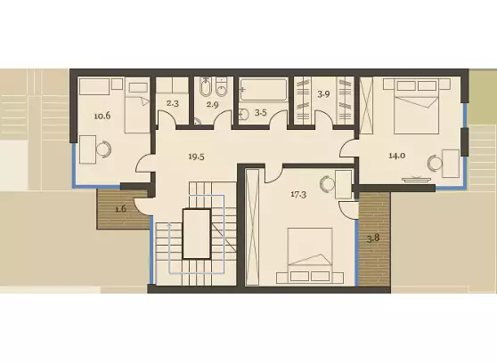 Клубный дом в составе комплекса — это 6-этажное здание на 19 квартир от 87 до 128 кв. м. Все квартиры дома — 3-х или 4-х комнатные — рассчитаны на семейное проживание, имеют оптимальную планировку, где большая часть комнат приближена к идеальным геометрическим формам.