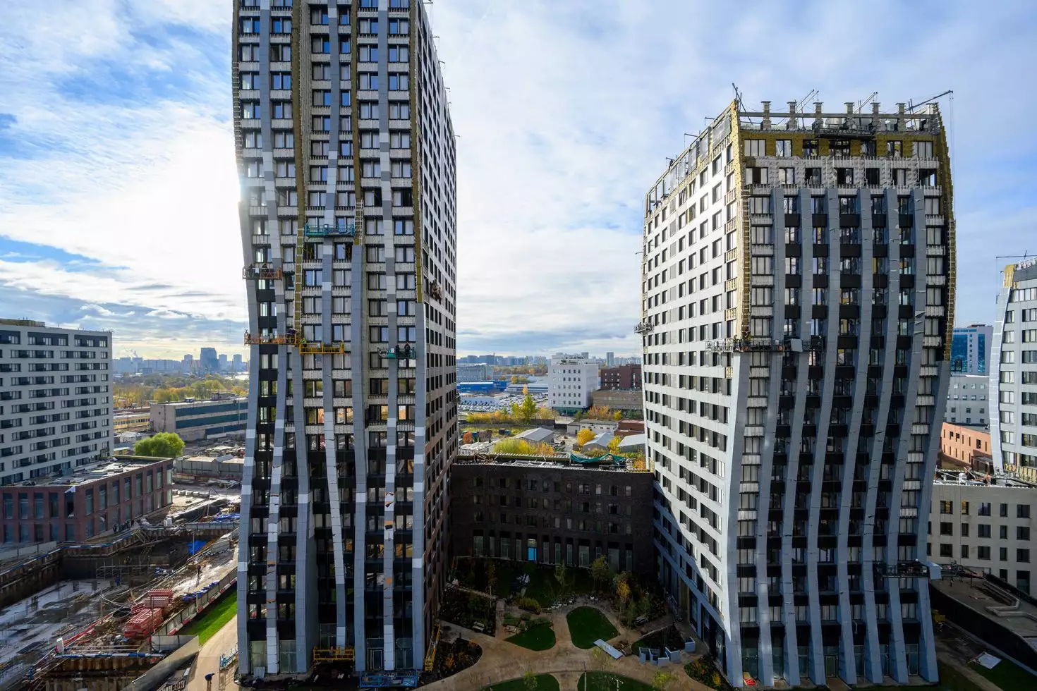 Архитектурный проект выполнен бюро СПИЧ, известным не только на территории нашей страны, но и в европейских странах. Стандарты на уровне мировых, современные технологические решения, эстетика и авторский контроль над реализацией позволяют бюро СПИЧ решать любые задачи. Достижения бюро отмечены неоднократными наградами. Уникальный дизайн фасадов, напоминает волны, что достигается за счёт плавно меняющейся глубины этажа. Динамика воды особенно становится заметна на высотных корпусах, где волна приобретает трёхчастную структуру: вдоль фасадов как будто струятся ленты динамически меняясь в зависимости от ракурса и интенсивности света. Завершенность образу придают прямые углы, использование оттенков серого. Этажность и месторасположение позволяет будущим жителям получить уникальные виды на Москву-реку, Москва-Сити, главное здание МГУ, парки "Коломенское"и "Кузьминки".